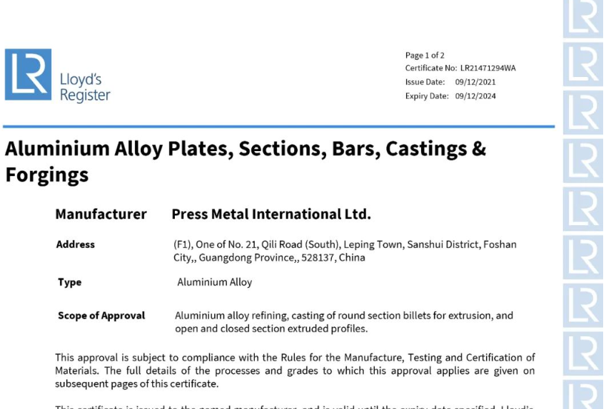 近期,澳美鋁業正式獲得英國勞氏船級社工廠認可證書。英國勞氏船級社(Lloyd’sRegister of Shipping 縮寫LR),也譯作英國勞埃德船級社,在世界船舶界享有盛名,是國際公認的船舶界權威認證機構之一。