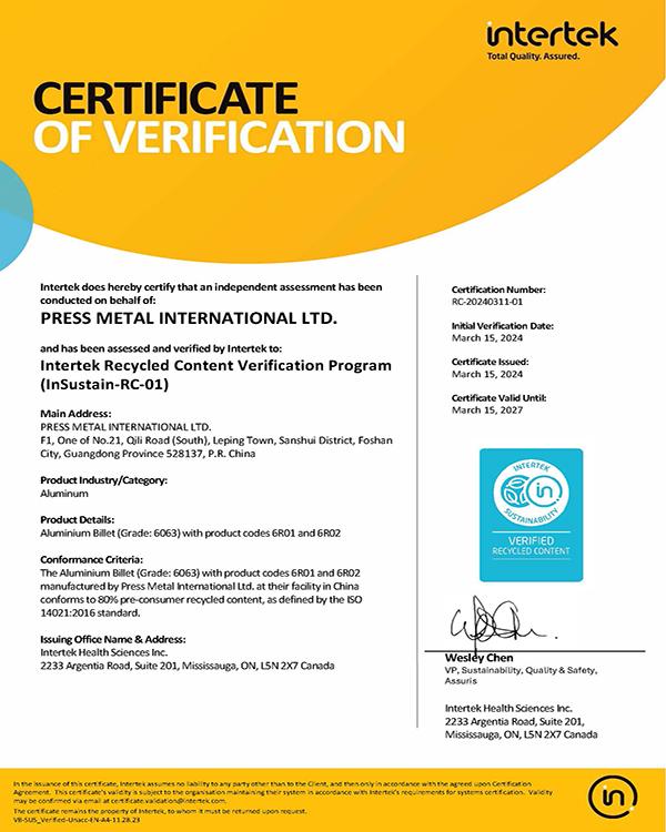 回收鋁Intertek-RCV證書(shū)